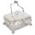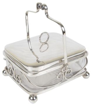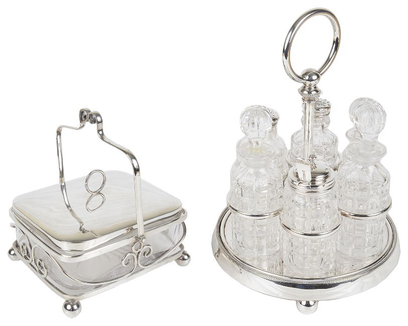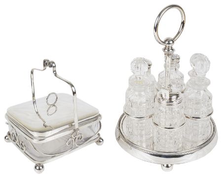 the glass rectangular dish inset in a silver-plated holder with swing handle and silver-plated cover with loop finial, bears marks to base of holder; together with a silver-plated rotating condiment suite of six glass oil bottles, pepperettes and mustard on a rotating stand with loop carry handle, (2).