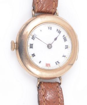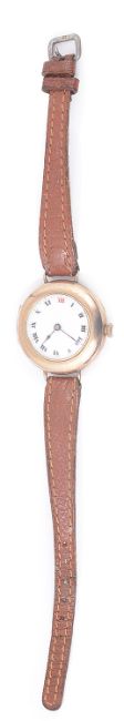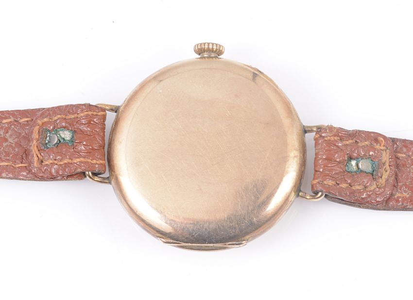 the circular white dial with Roman hours, spade hands in a circular case, with leather strap, movement marked Rolex, case back hallmarked 9ct gold.