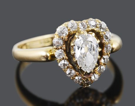 the centre tear shaped diamond approximately 0.45 carats and set within a delicate heart shaped diamond set border, circa 1850, yellow metal mount tests for gold.