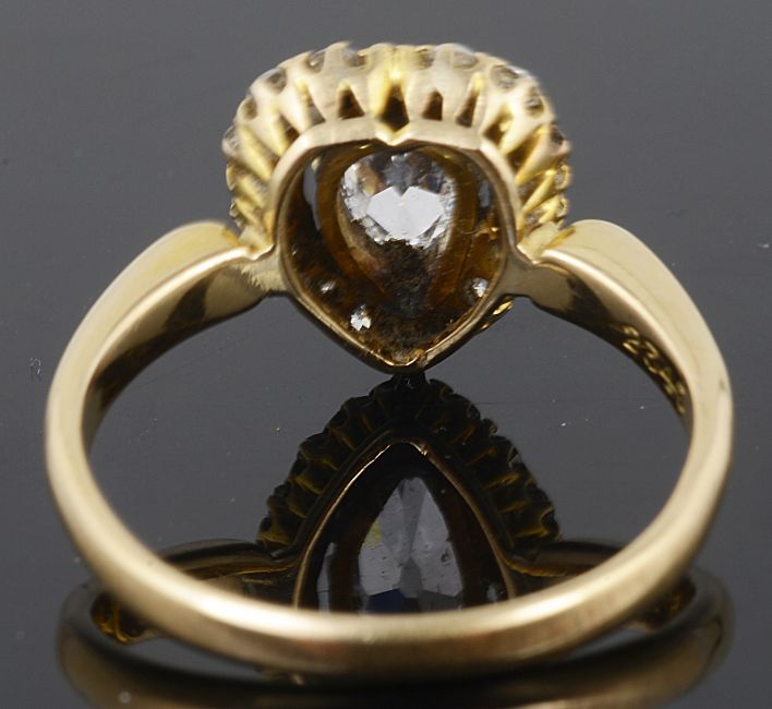 Condition: Overall good, no undue wear, pear shaped diamond no inclusions visible to the naked eye, bright white lively stone, one diamond at the bottom of the outer cluster has shifted in its mount to one side giving the appearance that it is darker, the remainder of the cluster stones are bright white and matched