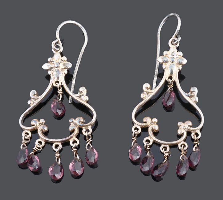 the silver gilt scroll mounts suspended with facetted tear drop garnets. mounts stamped .925 to reverse.