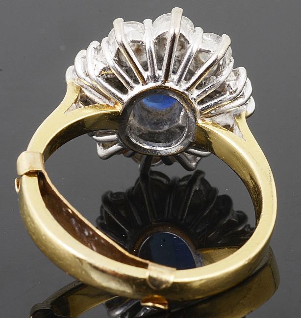 sapphire approx. 9.14 x 7.33 x 4.04 mm., total diamond weight approx. 1.32 carats