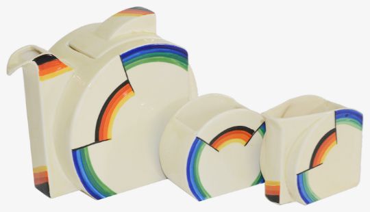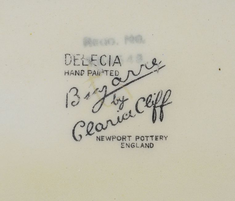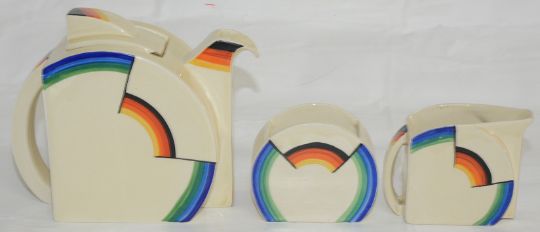 A Clarice Cliff "Delecia" Bizarre for Newport Pottery Stamford three piece tea set, hand painted geometric Art Deco design, printed marks,(3).
