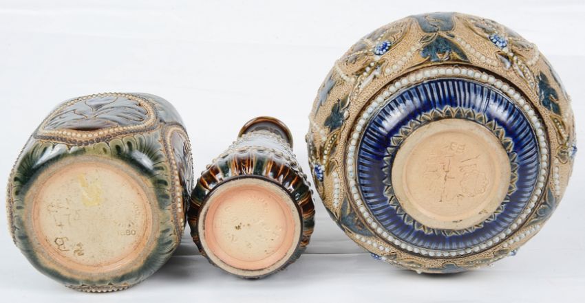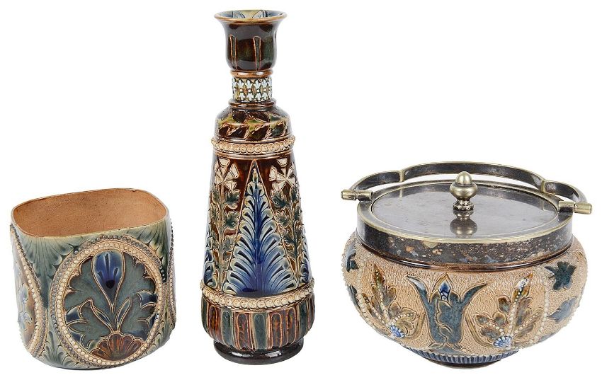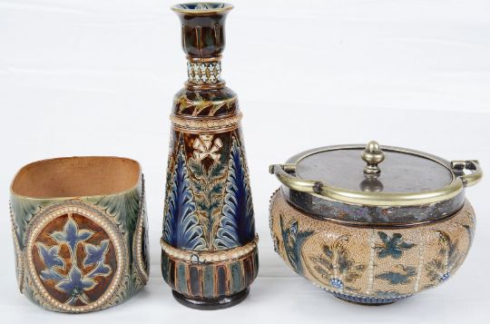 a Doulton Lambeth stoneware condiment jar with cover by Emma Marriott, circa 1882, the EPNS collar, swing handle and removable lid above a body incised with green, brown and bluish leaf continuous band, with reeded and beaded decoration, factory and incised marks to base; a Doulton Lambeth stoneware beaker by Jessie Bowditch, circa 1880, of square form with incised and beaded acanthus leaf panels, incised and factory marks to base; a Doulton Lambeth stoneware vase by Jessie Bowditch & Sarah Fisher, circa 1879, the tapered flared rim, above a tapered body incised with leaf and bead decoration, incised and factory marks to base, (3).