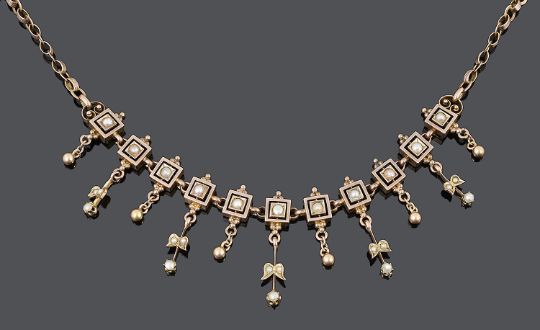 A delicate 19th Century seed pearl set foliate fringe drop necklace