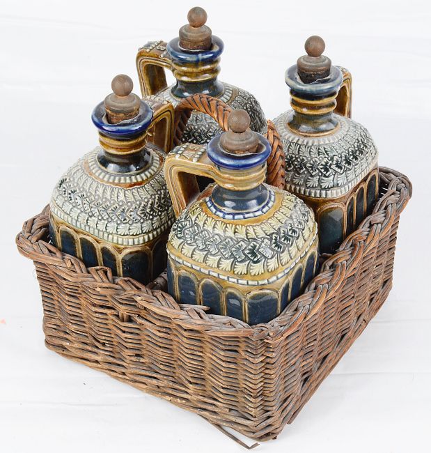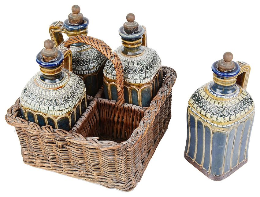 An unusual Doulton stoneware four decanter set in wicker basket