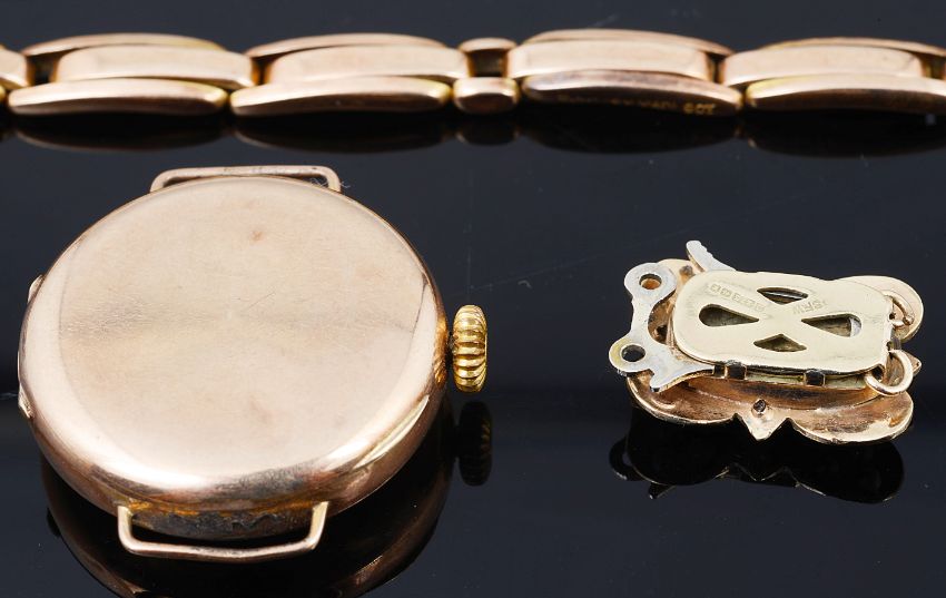 A 9ct gold ladies wristwatch, a 9ct gold garnet, with seed pearl and diamond necklace clap and a 9ct gold rope link necklace with 15ct gold dog clip