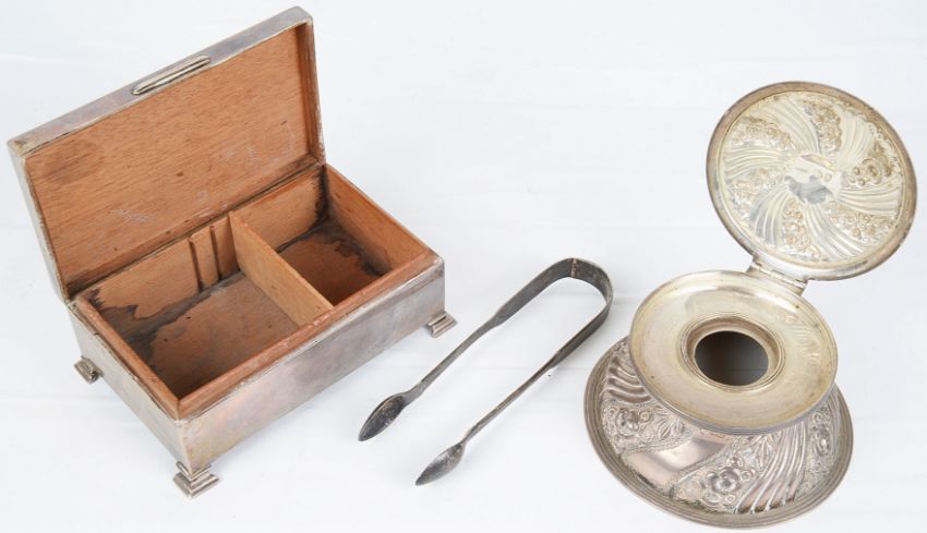 Condition: Fair to good, with minor surface scratches on each item, the sugar tongs has been repaired at the u-shaped end, no liner in the inkwell and the hinged lid is warped, tarnished.