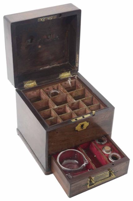 with hinged lid, revealing fourteen bottle compartments above a single drawer, with brass scales, glass pestle and mortar, glass vials, a.f.