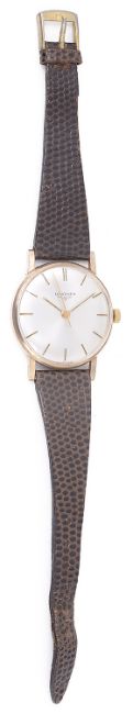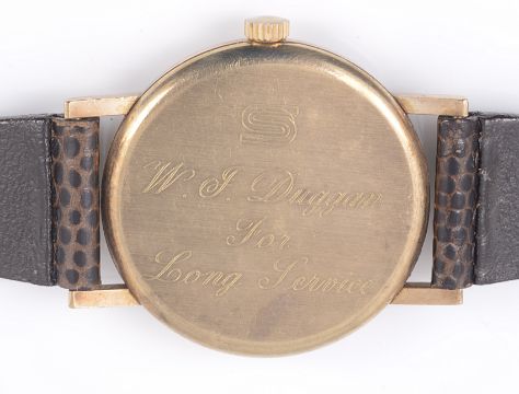 the circular dial with baton hours and hands, in a circular case with leather strap, movement number: 50708973, case number: 66884, case back engraved.