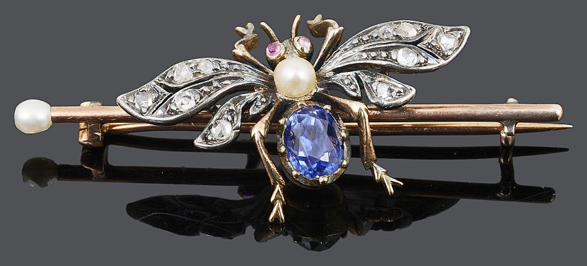sapphire approx. .1 x 4.3 mm., brooch approx. 4.8 cm. across, bug approx. 3 x 2.3 cm.