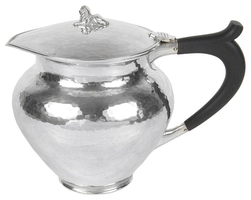 the hinged lid with lion finial above a bulbous tapered body with planished decoration and ebonised handle.