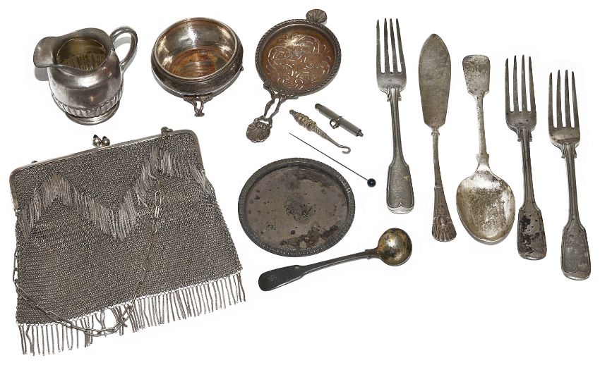 the Victorian silver squat cream jug, hallmarked London 1888 by Walter & John Barnard; a pierced silver tea strainer with bowl, hallmarked Birmingham 1935 by Hukin & Heath Ltd; a Victorian silver circular tray, hallmarked London 1869 by TF & Co.; three Victorian silver dessert forks, hallmarked London 1872 by Chawner & Co.; a Victorian silver dessert spoon, hallmarked Sheffield 1882 by John Edward Bingham; a silver dessert knife, hallmarked Sheffield 1896 by Atkin Brothers; a George III silver mustard spoon, hallmarked London 1810 by Robert Rutland, a silver-plated mesh handbag, a silver-plated button hook, (qty).