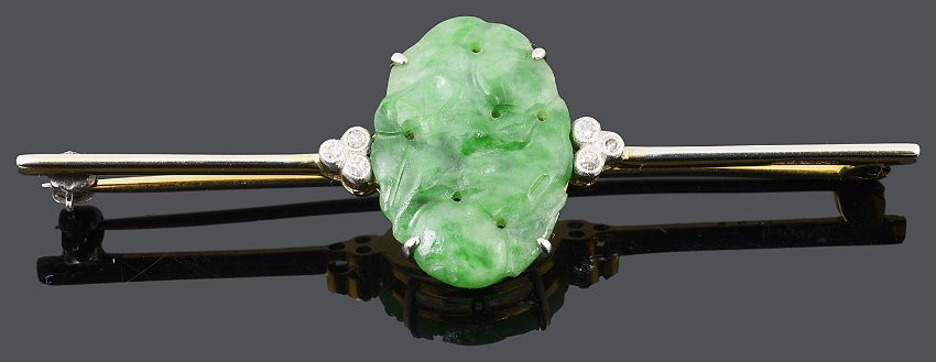 An Art Deco carved green jade and diamond set bar brooch