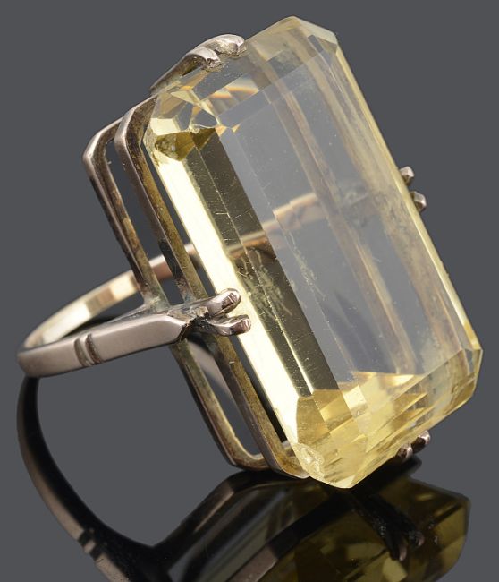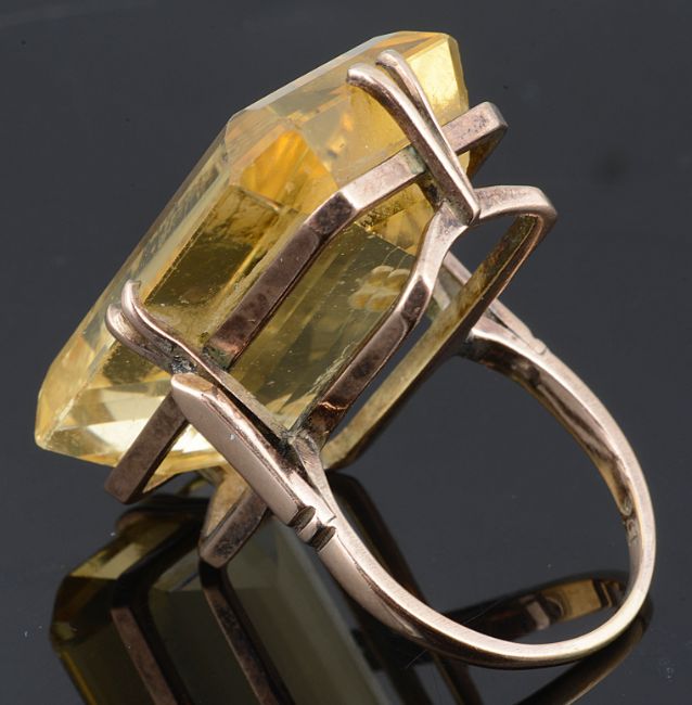 the rose coloured mount stamped 9ct and set with a large rectangular cut citrine.
