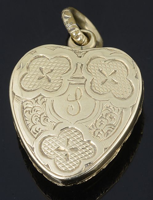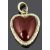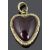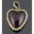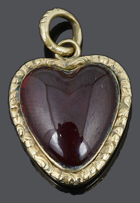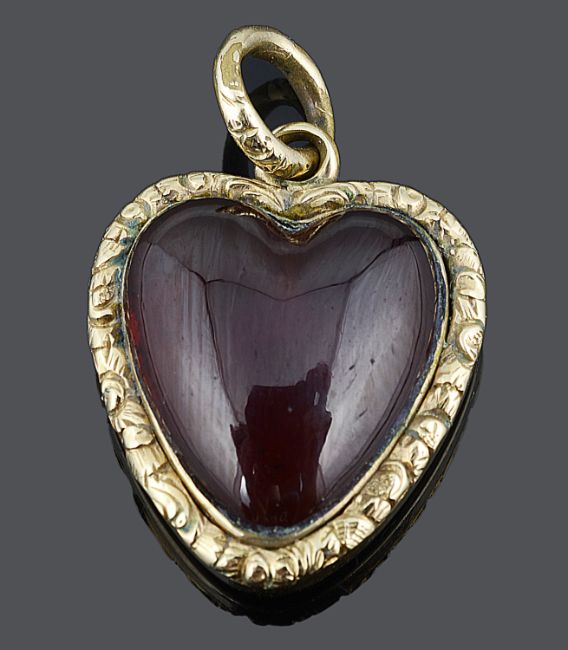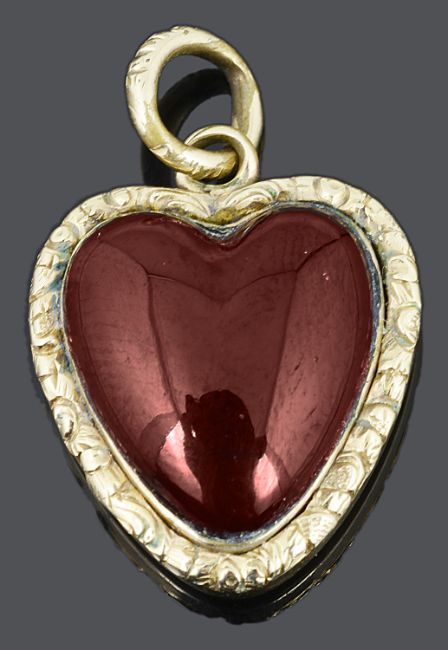 the heart shaped garnet in closed yellow metal mount with delicate foliate scroll decoration to border and to original suspension loop, scroll engraving to reverse, mount tests gold clad.