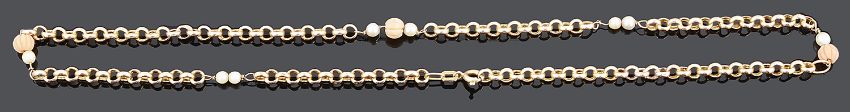 the rose coloured 9ct gold chain with carved coral beads and small river pearls.