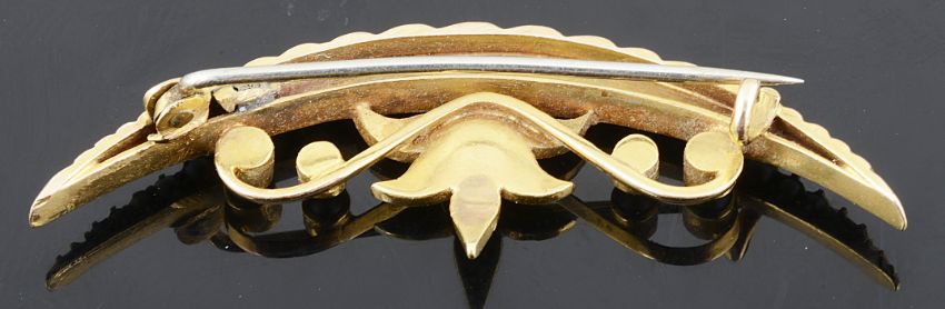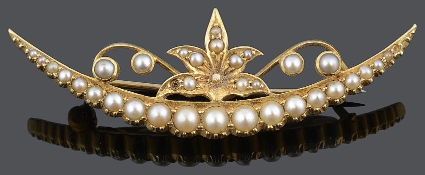 the crescent with graduating half pearls below stylised leaf and scrolls, yellow metal mount test for gold.