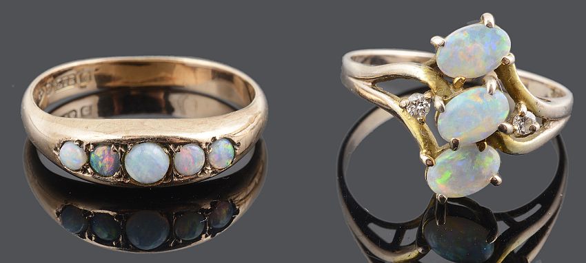 set with a row of five graduated opals together with a a contemporary 9ct three stone opal crossover ring, having a row of three oval opals, the central opal a raised setting flanked by a pair of brilliant cut diamonds, (2).