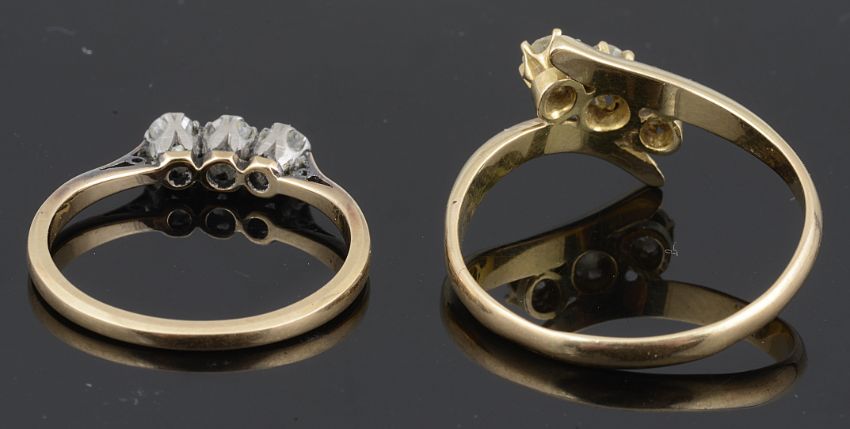 the claw set stones in yellow metal mount, marks rubbed, tests for gold, together with a small three stone diamond set ring, mount marked for 18ct & Platinum, (2).