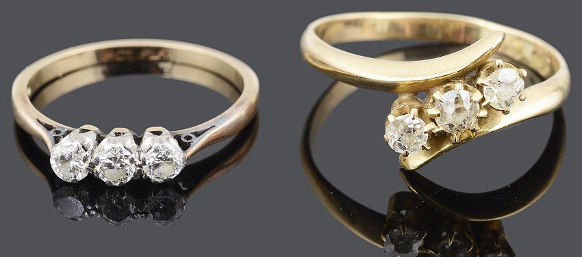 A three stone old cut diamond set twist ring