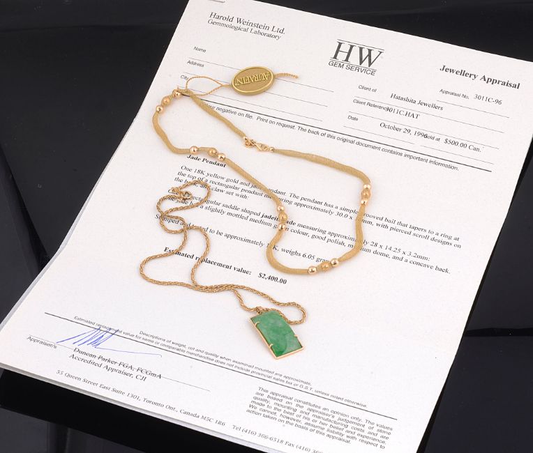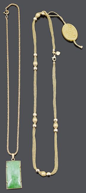 An 18ct gold mounted green jadeite jade pendent the claw set rectangular jadeite panel having a bail with pierced scroll design verso, marked 18kt on a 10ct twisted articulated mesh link neck chain, in a fitted Hatashita jewellery box with accompanying gemmological laboratory appraisal, together with a 14ct gold Italian Aurafin Soft Gold mesh necklace in original presentation wallet, (2).jadeite panel 28 x 14.25 x 3.2 mm, chain length approx. 40 cm, total weight 14.1g., 14K chain approx. 5 gm., 10ct. chain approx. 3 gm.Condition: Overall in good condition