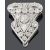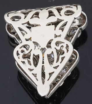 of pierced scroll form having central collet set diamond within a diamond set triangle with row of diamonds above and diamond set scroll chevron below, ornately scroll pierced back clip, white metal tests for gold.
