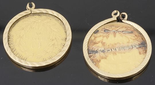 the coin 0.900 gold, Obverse: head facing right, Napoleon III Empereur Barre; Reverse: Empire Francis 10 Francs 1856 A & 1858 BB, each in a matching 9ct gold earring mounts, hallmarked, (2).