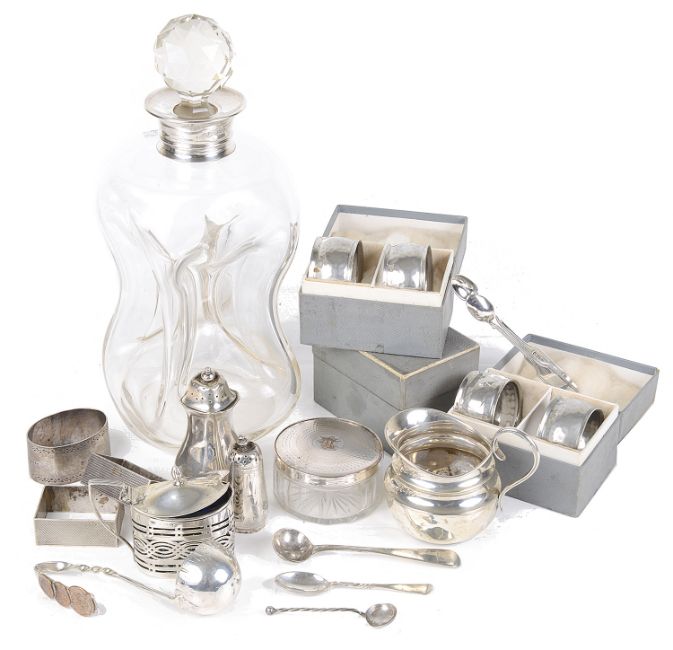 a pair of silver engine turned rectangular napkin rings, hallmarked Birmingham 1941 by William Suckling; together with a Victorian oval napkin rings, hallmarked London 1888 by William Hutton & Sons; a Victorian squat cream jug, hallmarked Birmingham 1892 by S Bros; a silver pepperette, hallmarked Birmingham 1908 by Hukin & Heath; an Edwardian silver mustard with blue glass liner, hallmarked Birmingham 1909 by William Aitken; a glu-glug glass decanter with silver collar, hallmarked Sheffield 1906; a Victorian silver pepperette, hallmarked Birmingham 1883 by Hilliard & Thomason; Victorian silver sugar nips, hallmarked London 1861 by H J Lias & Son; four silver spoons; a silver-plated glass powder container and six planished pewter napkin rings, (qty).