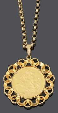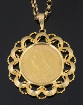 the coin 0.916 gold, Obverse: older veiled bust of Queen Victoria left, VICTORIA.DEI.GRA. BRITT.REGINA.FID.DEF.IND.IMP; Reverse: Saint George slaying the dragon right, date in exergue 1895, in a 9ct gold scrolled mount with chain loop and a 9ct gold belcher chain.