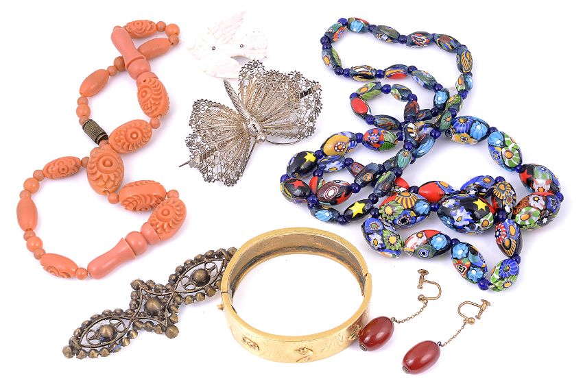 including a pair of cherry amber bead drop earrings, a gilt Edwardian bangle with raised stork decoration a.f., large filigree butterfly brooch, tests for silver, carved peach bakelite bead necklace, Victorian carved angel skin coral bird brooch, (7).