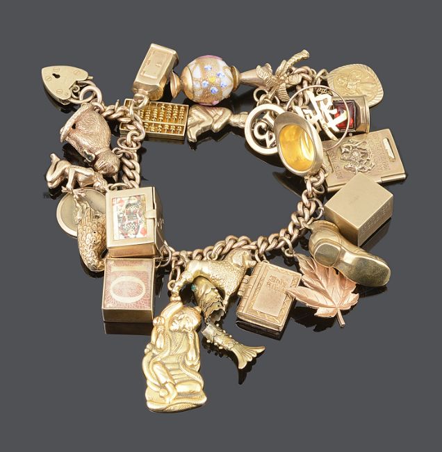 the bracelet with each link stamped .375 with mainly 9ct gold charms, some interesting charms including British Passport, 14K abacus, pack of cards, poodle, ships lanterns, vase, palm tree etc.