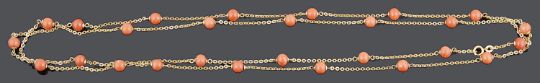 the long 18ct gold chain set with even spaced, single matched natural red coral beads, marked for 18ct gold,