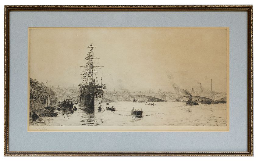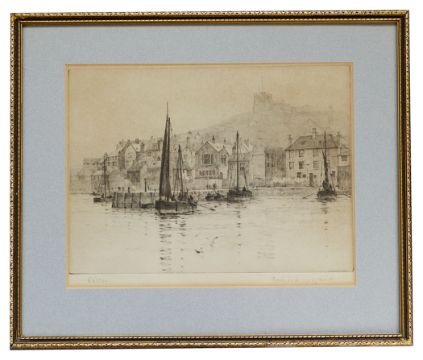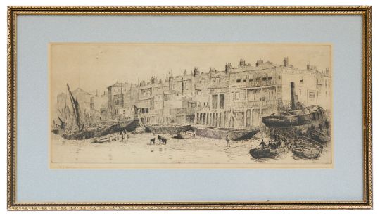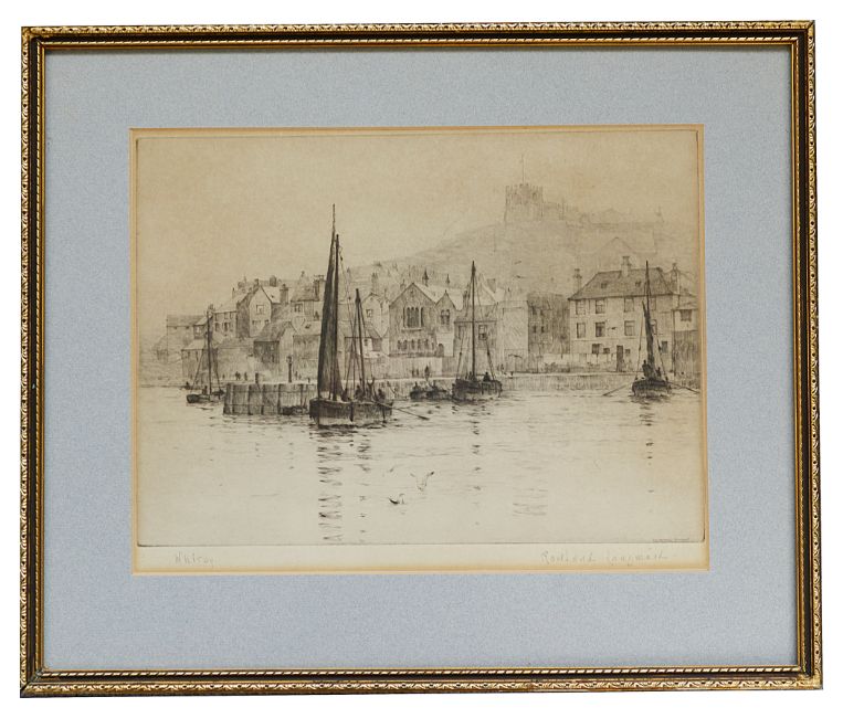 two etchings, 'Victoria Rail Bridge on the Thames' and 'Banks of the Thames', both signed in pencil on lower margin, mounted and framed; together with Rowland Langmaid (British/Canadian, 1897 - 1956), etching of 'Whitby', signed in pencil lower margin, mounted and framed, (3).