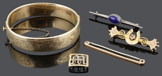 having floral and scroll detail, marked to reverse, together with a 9ct gold bar brooch, a 9ct metal core hinged bangle, a seed pearl set initial 'M' slide and two other brooches, (5).