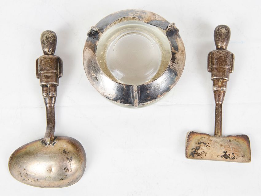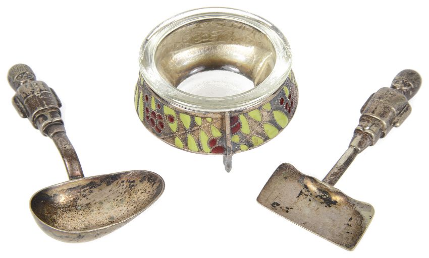 the pusher and spoon with handles in the form soldiers wearing bearskins, marked EPNS BCM/PRIAUR REG RD723041 together with a Russian enamelled cauldron salt with clear glass liner, marked 610MMET M3P00K, (3).