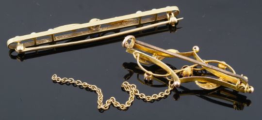 the former with yellow metal mount testing for gold, the latter having central sapphire within seed pearl set scrolls and further small pearl detail, clasp stamped 14K (2).