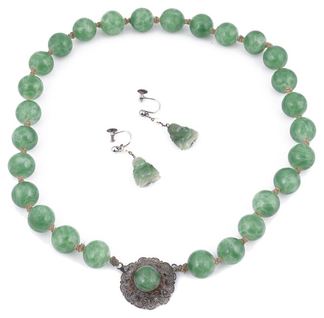 the carved Buddha's suspended below a single small cultured pearl on fine white metal chain, later white metal fittings, together with a Chinese Art Deco faux jade glass bead necklace with white circular white metal silver filigree fancy clasp, tests for silver, character mark to reverse, associated earring box, (2).