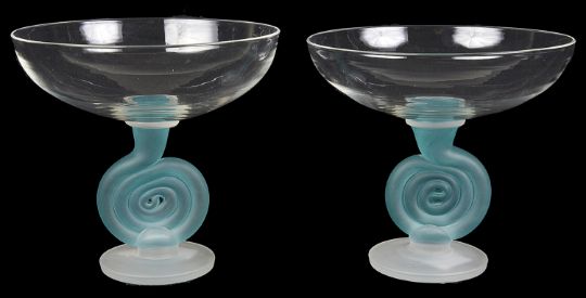 the clear glass circular bowls raised upon a pale blue coil on a frosted circular base, each etched to the base, (2).