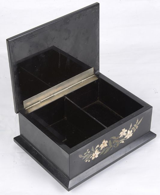 rectangular, the hinged cover and front inlaid with a sprays of roses, forget-me-nots, lily of the valley, convovulus and jasmine. The interior fitted with a divider.