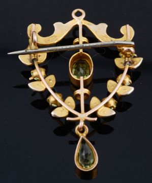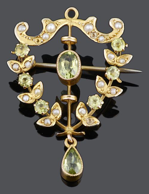 An Art Nouveau peridot and seed pearl pendant brooch