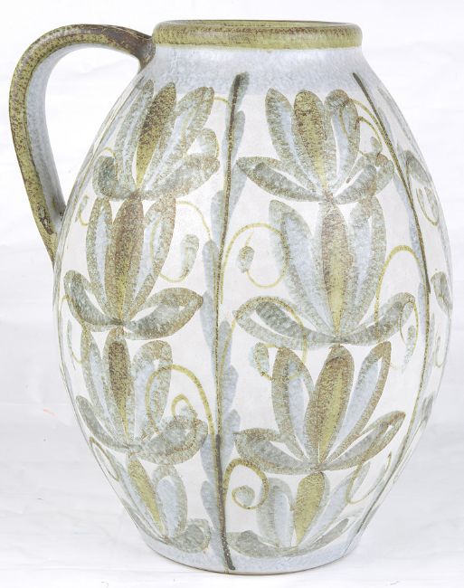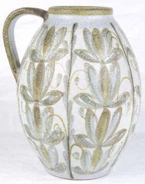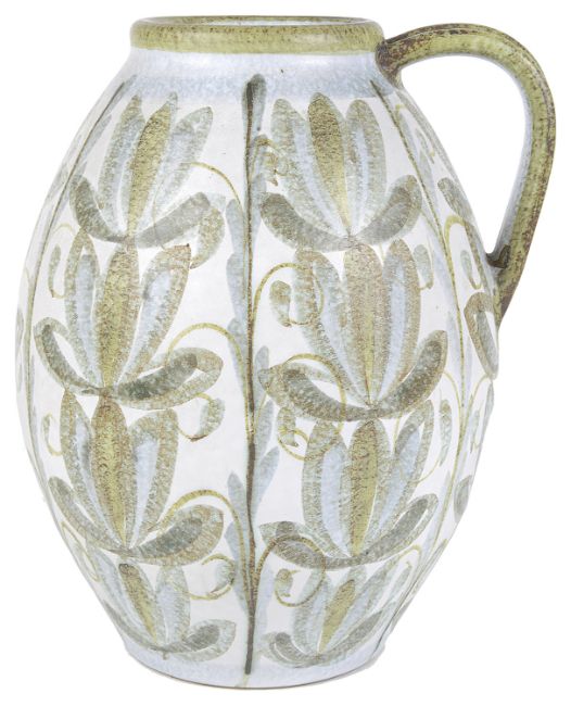 of ovoid form with strap handle, decorated with foliage, printed marks.