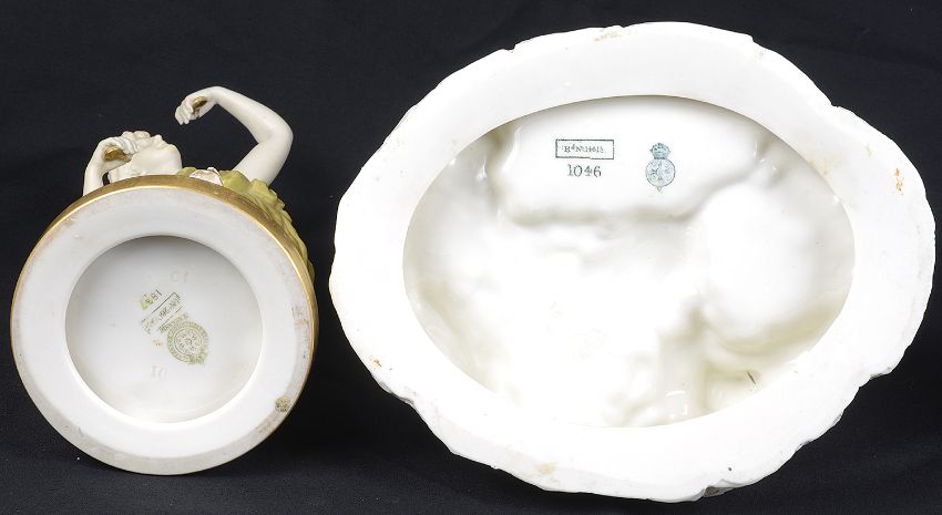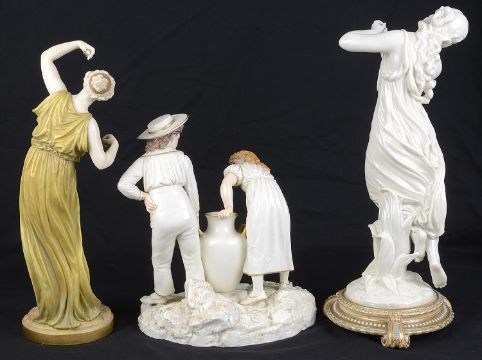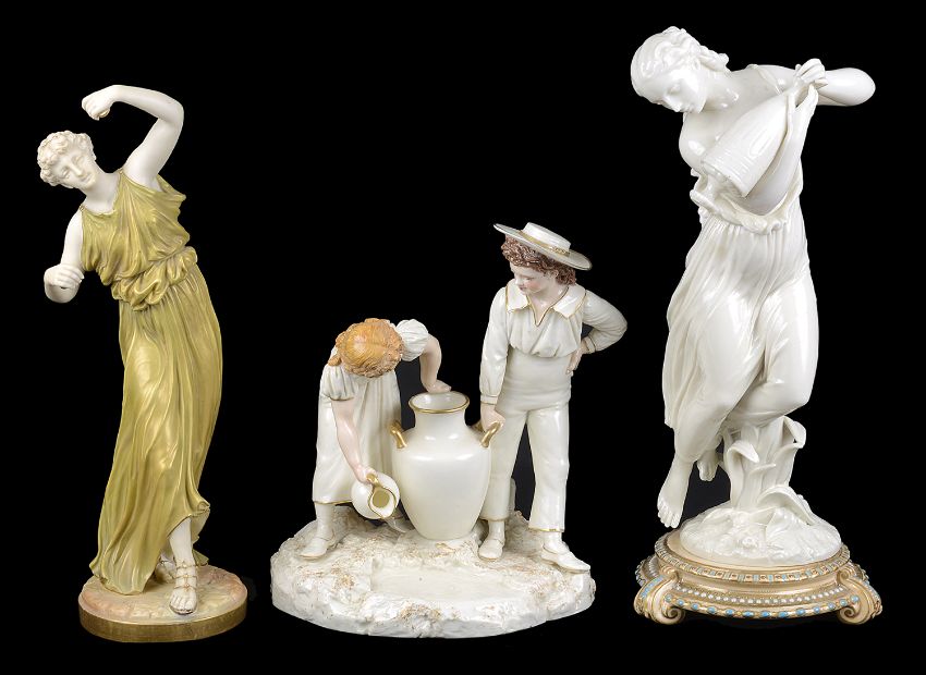 A Royal Worcester porcelain figure group, circa 1884, white glazed with gilded highlights, modelled after Hadley, as a Kate Greenaway style boy and girl collecting water and holding a large pitcher between them, green printed and impressed marks to base with model No.'1046', together with a white glazed porcelain figure modelled as a scantily clad maiden with a water vessel, raised on a 'jewelled' circular base, and a Royal Worcester shot enamel decorated figure modelled as Dancing