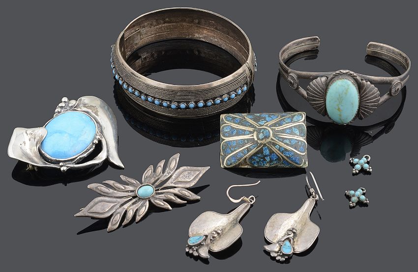 A collection of Navajo silver and turquoise jewellery