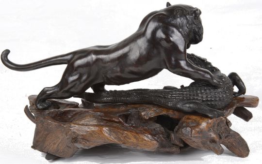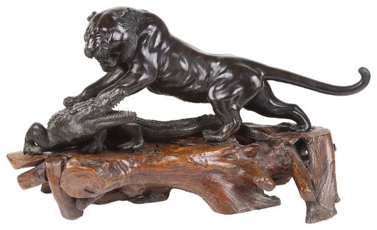 A good late 19th century Japanese Meiji period bronze sculpture of a tiger attacking an alligator