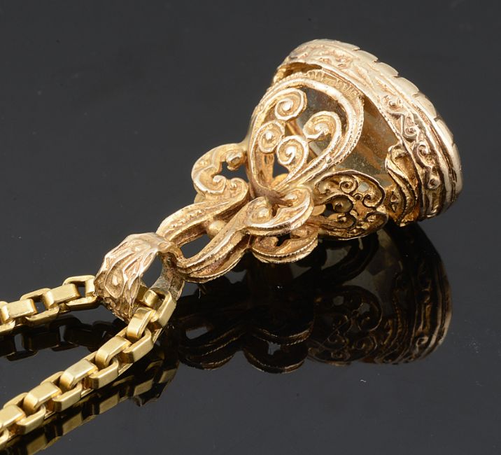 chain approx. 23 gm., seal fob approx. 8 gm. please note these weights are approximate as items are attached, total weight of both items approx. 31.8 gm