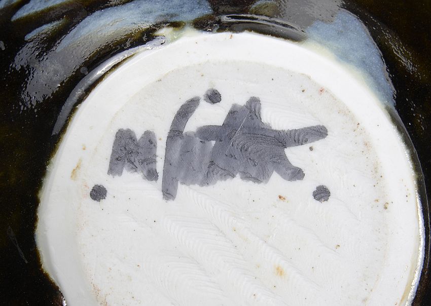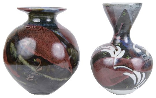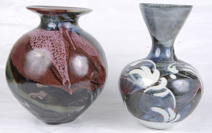 one of spherical form with a flattened everted rim, decorated in streaky copper red and ash glazes, signed M Frith, the other bottle shaped with flared conical neck, decorated with wax and blue and copper red glazes, bears potters seal and stamped MF, (2).