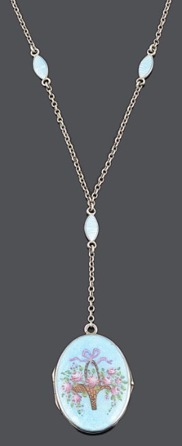 the oval hinged picture locket enamelled with a posy basket on a blue guilloche enamel ground an suspended from an integral silver and enamel link neck chain.