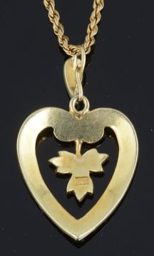 the open heart having central stylised leaf motif and original seed pearl set suspension loop, stamped 15ct to reverse, suspended on a 15ct gold rope twist neck chain, barrel clasp fastening.