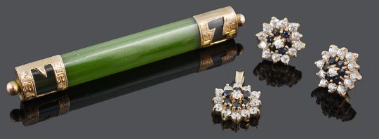 the polished bar with scroll engraved rose metal ends and initials N and Z, mounts test for gold, together with a modern gem set cluster pendant and ear studs, mounts test for gold, (3).